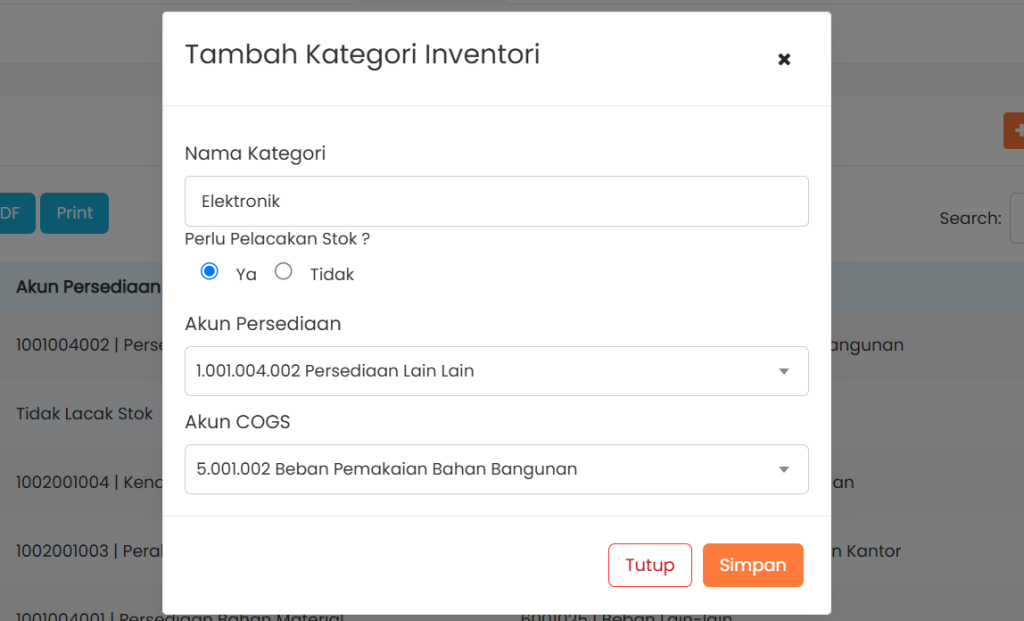 2. Isi data kategori barang dengan lengkap, seperti Nama Kategori, pilih apakah perlu pelacakan stok, lalu tentukan Akun Persediaan dan Akun COGS