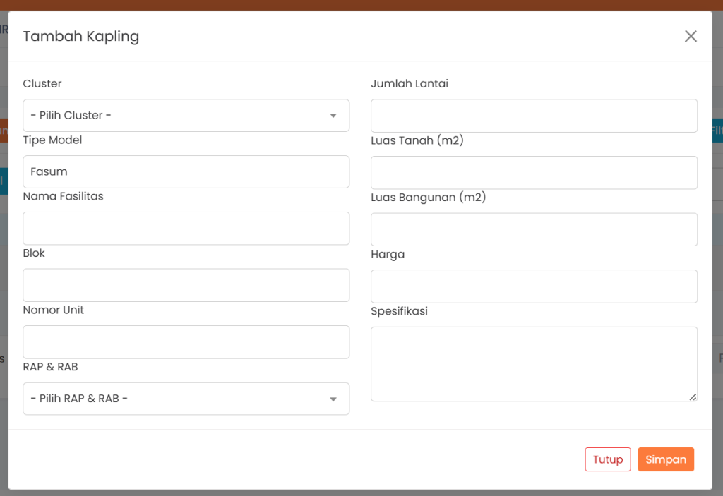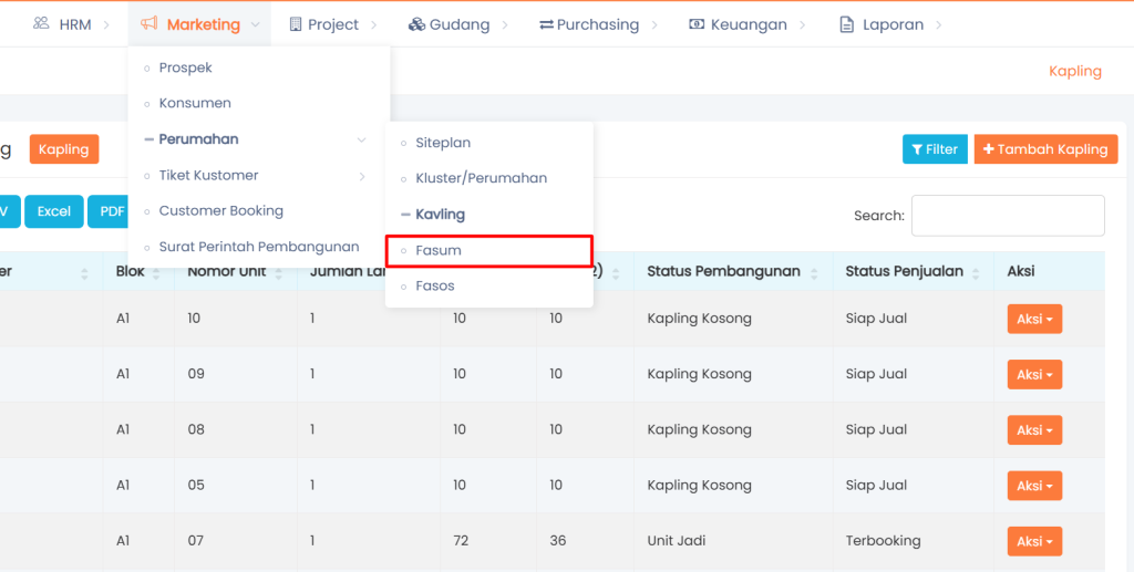 Pilih menu Perumahan, lalu klik menu Fasum, kemudian pada halaman baru data fasilitas umum klik Tambah Kapling