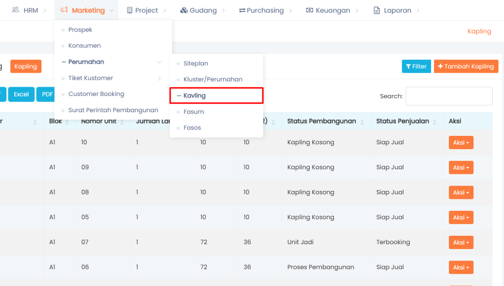 Pilih menu Perumahan, lalu klik menu Kavling, kemudian pada halaman baru data kavling klik Tambah Kapling