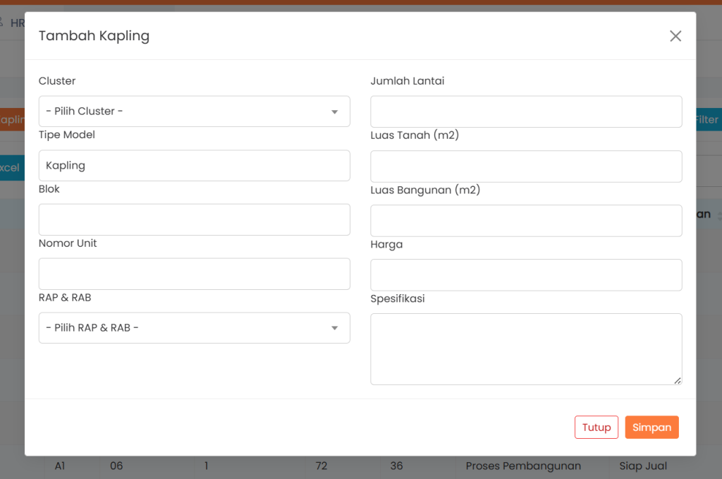 2. Isi data kapling dengan lengkap seperti Jenis Cluster, Jumlah Lantai, Blok dll dengan lengkap