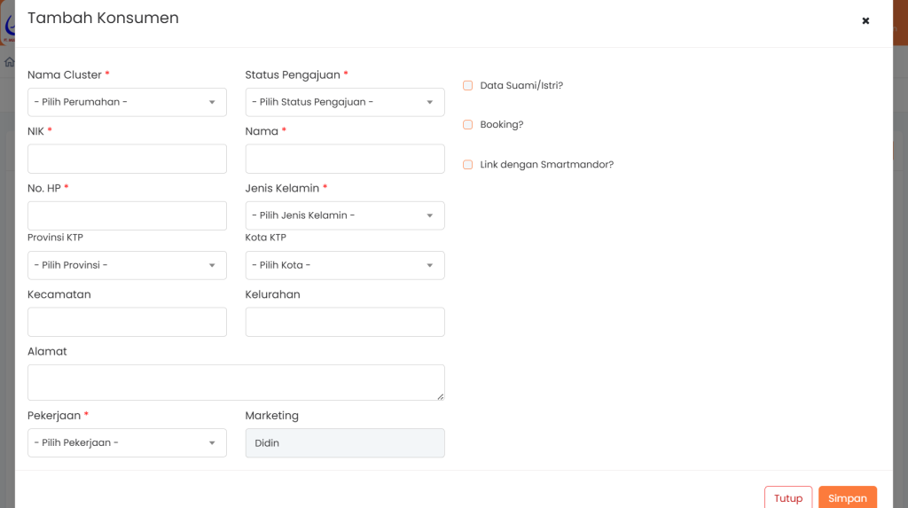 2. Isi data konsumen dengan lengkap, seperti Pilih Perumahan, Nama, NIK, dll dengan lengkap (Kolom dengan tanda * wajib diisi)