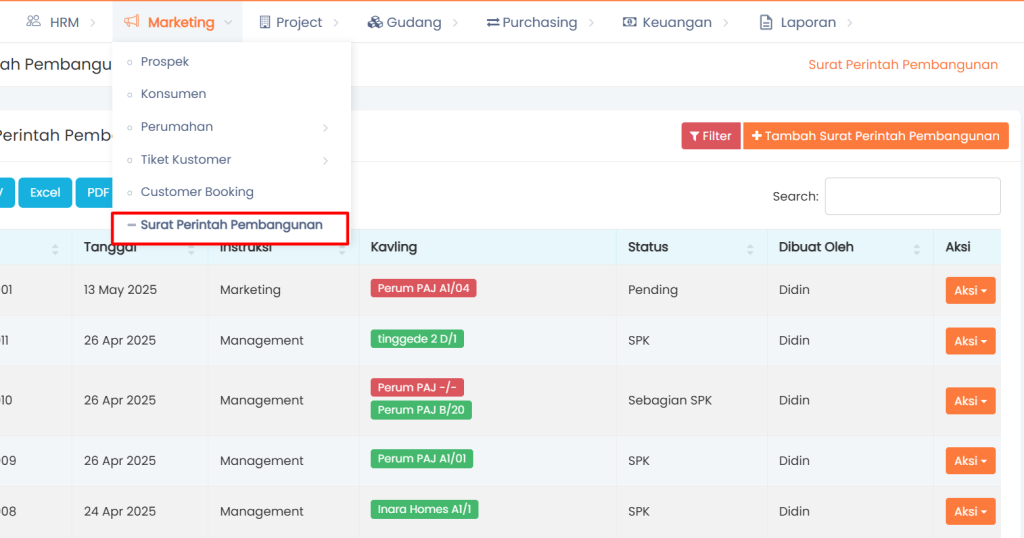 Pilih menu Surat Perintah Pembangunan, kemudian pada halaman baru data Surat Perintah Pembangunan klik  Tambah Surat Perintah Pembangunan