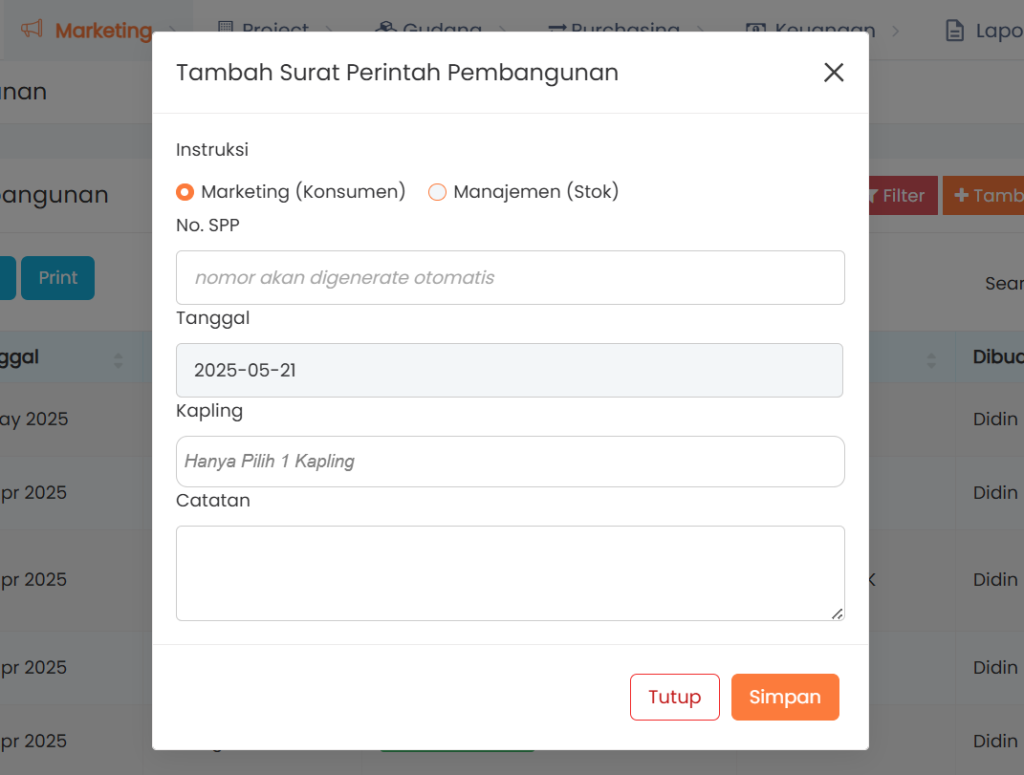 2. Isi data Surat Perintah Pembangunan dengan lengkap, seperti memilih Intruksi, No. SPP, Tanggal dll dengan lengkap
