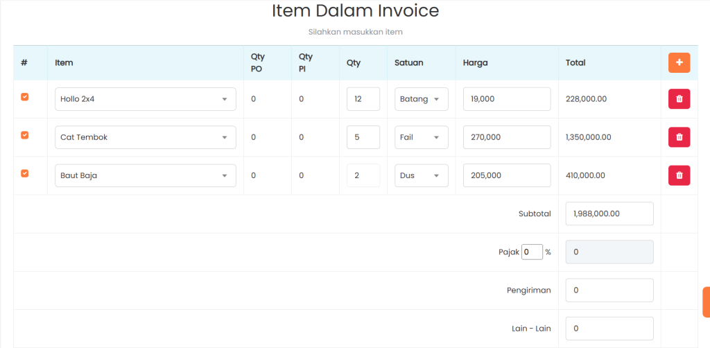 3. Pada tabel Item dalam Invoice, klik tombol ‘+’ untuk menambahkan baris barang baru.