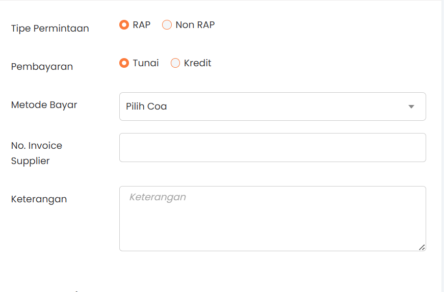 Pilih Tipe Permintaan untuk menentukan jenis permintaan pengeluaran. Selanjutnya, tentukan jenis pembayaran yang akan digunakan. Pada dropdown Metode Bayar, pilih akun pembayaran yang sesuai. Masukkan No. Invoice Supplier sebagai referensi tagihan dari pihak supplier, lalu isi bagian Keterangan untuk memberikan informasi tambahan terkait permintaan tersebut.