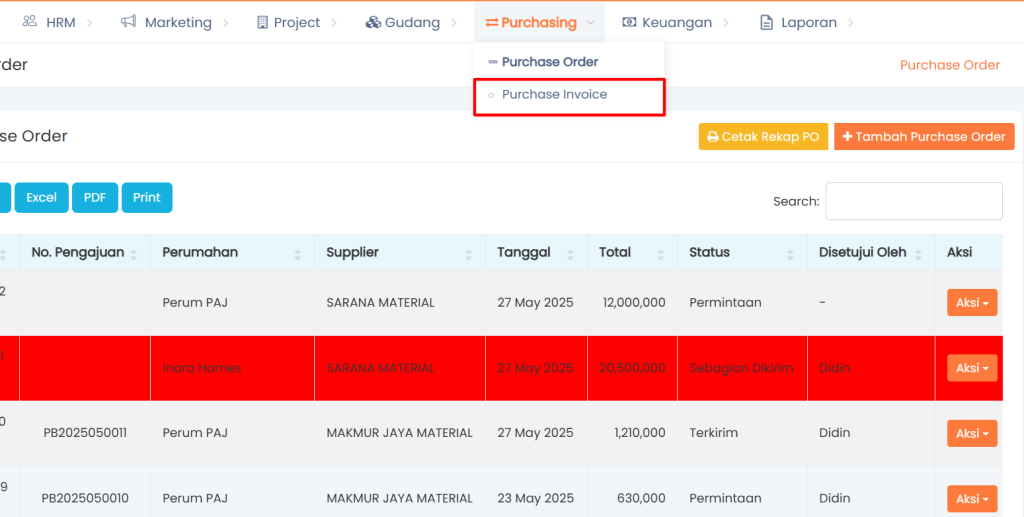 Pilih sub menu Purchase Invoice, kemudian pada halaman baru data klik Tambah Purchase Invoice, pada dropdown ini muncul dua pilihan, pilih Pembelian Cash/Tarik dari PO untuk pembelian barang secara langsung